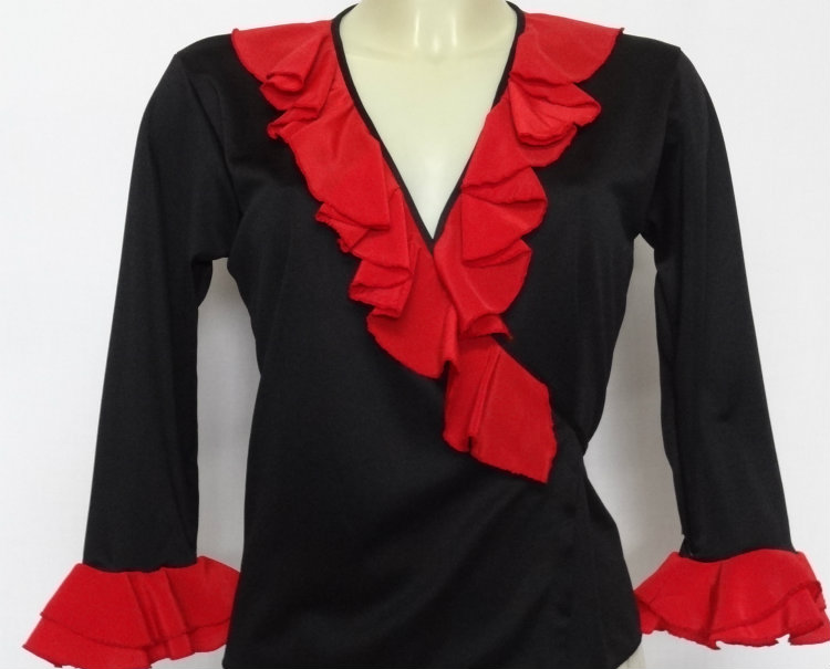 Cache-coeur croisé avec lien à la taille, volanté décolleté et bas des manches pour danser sévillanes et flamenco, tissu polyester, facile d’entretien