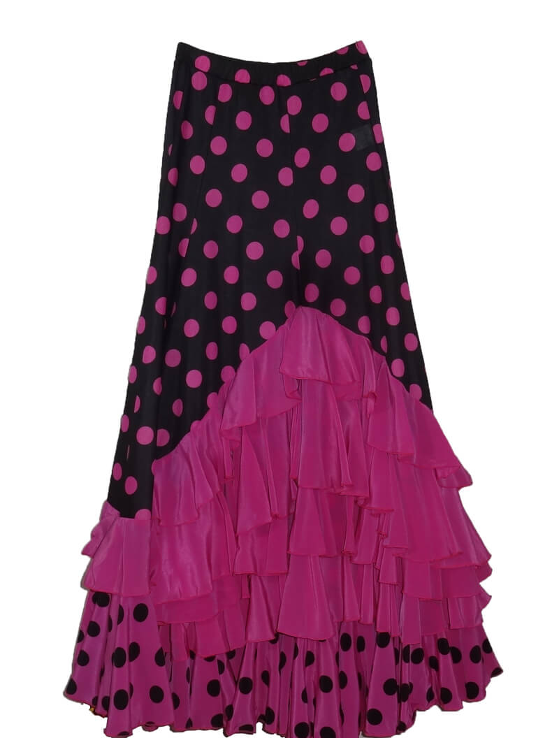 JUPE FLAMENCO OU SEVILLANE NOIR A POIS FUSHIA