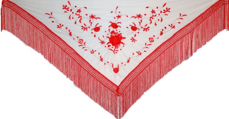 Châle blanc brodé rouge pour agrémenter les tenues Flamenco, pouvant s’assortir avec beaucoup de couleurs.