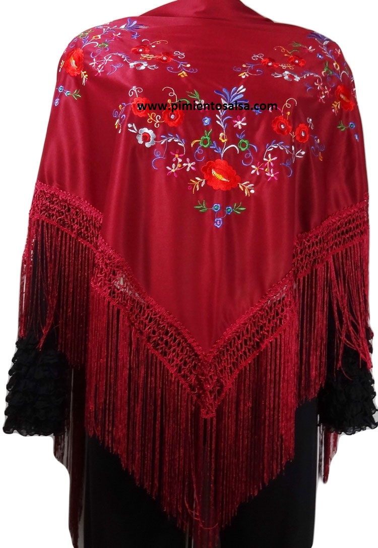 Châle blanc brodé rouge pour agrémenter les tenues Flamenco, pouvant s’assortir avec beaucoup de couleurs.