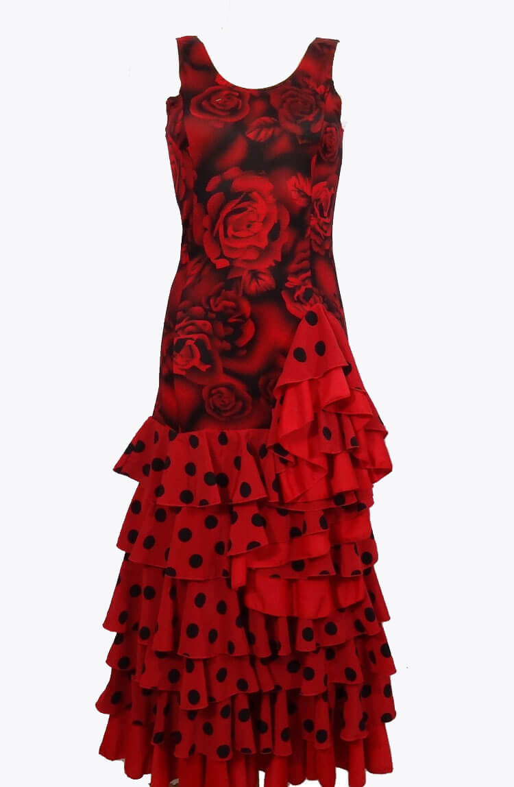 Robe fillette sans manche en punto imprimé fleur avec 5 volants à pois et cascade de volants pouvant servir pour des galas ou pour les cours.